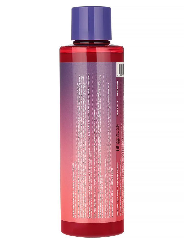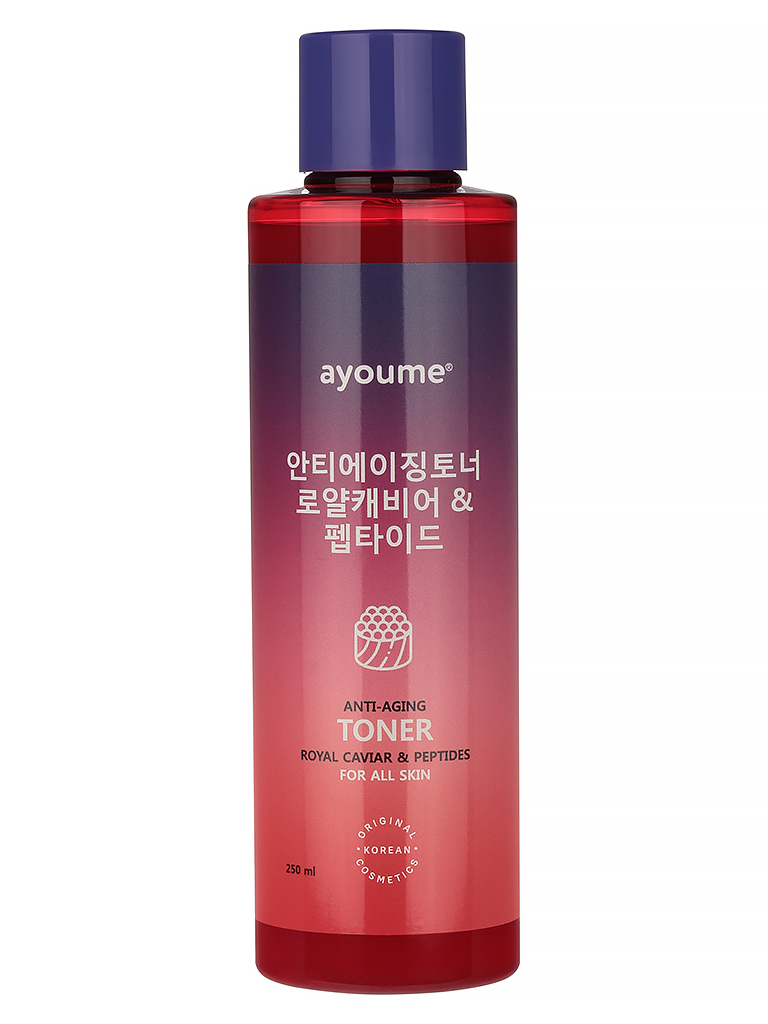 Антивозрастной тонер для лица AYOUME Anti-Aging TONER - Royal Caviar & Peptides обеспечивает интенсивное омоложение и лифтинг-эффект. Формула с экстрактом королевской икры и комплексом пептидов (гексапептид-9, медный трипептид-1, олигопептид-32, олигопептид-29, ацетил гексапептид-8) стимулирует выработку коллагена, повышает упругость кожи и сокращает глубину морщин. Легкая текстура быстро впитывается, обеспечивая эффект лифтинга без липкости. Подходит для всех типов кожи.