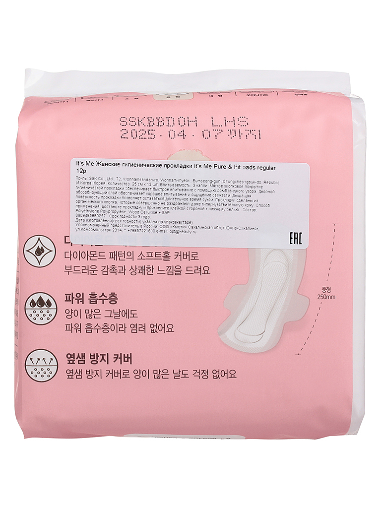 Гигиенические прокладки с крылышками It's Me Pure & Fit Regular обеспечивают надёжную защиту и комфорт в критические дни. Модель с впитываемостью 4 капли (стандартный показатель для регулярных выделений) выполнена с мягким поверхностным слоем из натурального хлопка, который исключает раздражение даже самой чувствительной кожи. Специальный ромбовидный рисунок на поверхности способствует моментальному впитыванию влаги, а двойной абсорбирующий слой надёжно удерживает жидкость, обеспечивая длительное ощущение свежести и сухости. Дышащая основа прокладки способствует оптимальной циркуляции воздуха, сохраняя комфорт на протяжении всего дня использования.