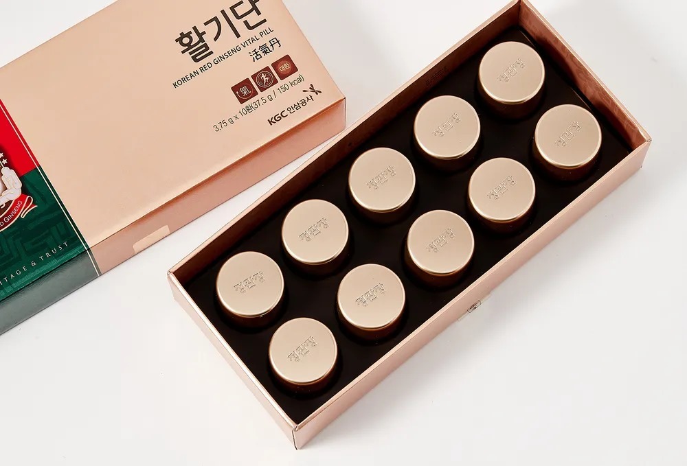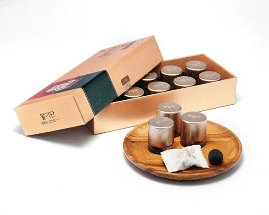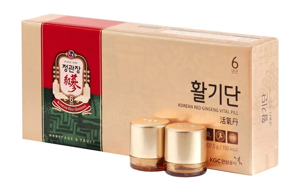 Состав: Экстракт порошка 6-летнего корейского красного женьшеня (15,30%), палатиноза (14,70%), соевый порошок (14,31%), глицерин (14%), фруктоолигосахарид (10,3%), порошок лекарственного кизила (7%), мёд (5,19%), порошок 6-летнего корейского красного женьшеня (5%), экстракт кожуры цитруса (5%), кристаллическая целлюлоза (3%), смесь травяных экстрактов (3%) (ягода годжи (27%), корейский корень дягиля (27%), китайский финик (27%), корень имбиря (18,5%), олений рог (0,5%)), порошок ремании клейкой (1%), витаминно-минеральная смесь (1%) (витамин C (регулятор кислотности E300), никотинамид, витамин Е порошок, витамин B1, витамин B2 (пищевой краситель Е101), витамин B6, ацетатный порошок витамина А, фолиевая кислота, таурин, витамин D3 порошок), ксилит (1%), натуральный ароматизатор (корица) (0,1%), порошок экстракта солодки (0,1%). Способ применения Взрослым принимать, тщательно разжёвывая, по 1 драже (3,75 гр) в день во время еды.