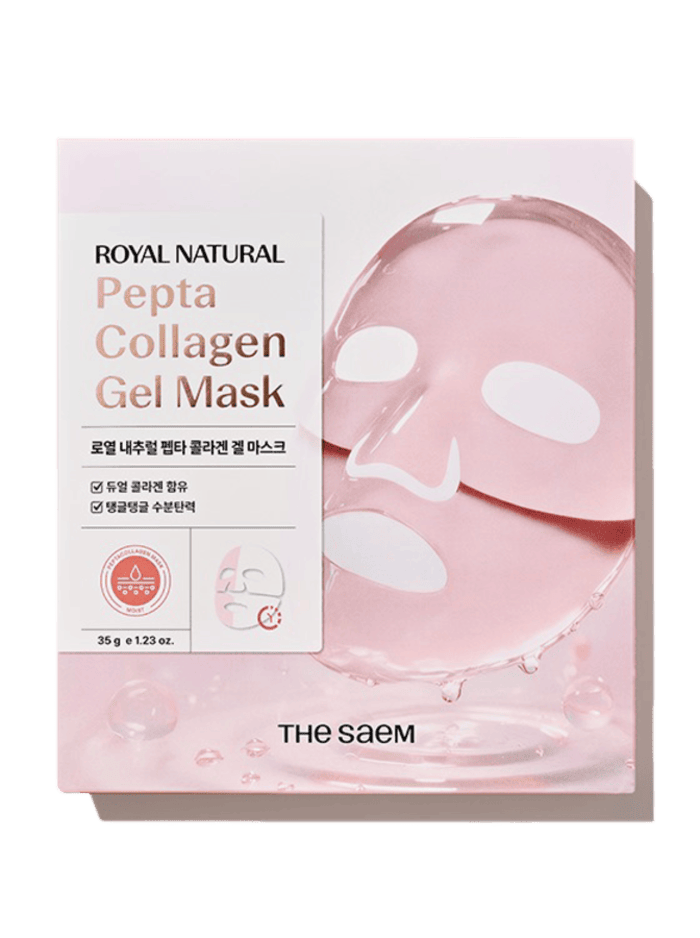 Гелевая маска Royal Natural Pepta Collagen Gel Mask — THE SAEM Royal Natural Pepta Collagen Gel Mask. Интенсивная гелевая формула сочетает мощное увлажнение и выраженный лифтинг: средство мгновенно подтягивает контуры, повышает упругость и разглаживает мелкие морщины, при этом заметно улучшая тон и текстуру кожи уже после первого применения. В основе комплекса — ниацинамид, гидролизованный коллаген, многофункциональные гиалуронаты и пептиды (ацетилгексапептид-8, медный трипептид-1, пальмитоилпентапептид-4), а также церамид NP и пантенол — эти компоненты усиливают восстановление кожного барьера, стимулируют выработку собственного коллагена и эффективно снимают следы усталости и стресса. Плотная гелевая текстура обеспечивает плотный контакт с лицом и равномерную доставку активных веществ, поэтому маска подходит тем, кто хочет получить видимый «салонный» лифтинг и одновременно долговременное улучшение состояния кожи. Подходит для всех типов кожи, в том числе для уставшей и лишённой тургора.