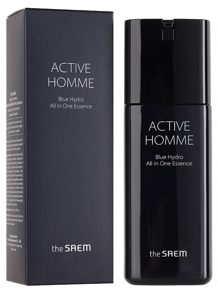 THE SAEM Active Homme Blue Hydro All in One Essence — универсальное средство «всё в одном», созданное специально для мужской кожи, нуждающейся в быстром, но эффективном уходе. Эссенция сочетает в себе функции тонера, лосьона и крема, обеспечивая кожу оптимальным уровнем увлажнения и питания без липкости и блеска. Формула на основе морской воды и гидролизованного коллагена восстанавливает упругость и плотность кожи, придаёт ощущение свежести и ухоженности после бритья. Экстракты морских водорослей активно насыщают клетки микроэлементами, способствуют восстановлению повреждённого эпидермиса и защищают от негативного воздействия окружающей среды. Благодаря содержанию ниацинамида и аденозина, средство эффективно борется с первыми признаками старения: осветляет тусклую кожу, выравнивает её тон, разглаживает мелкие морщины и придаёт лицу более здоровый и энергичный вид. Текстура эссенции быстро впитывается, не оставляя жирного блеска, что делает её идеальной для повседневного использования после умывания или бритья.